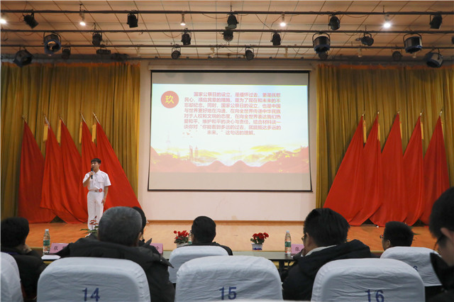 40载物转星移、岁月如歌。为纪念改革开放四十周年、“一二.九”爱国学生运动以及国家公祭日,切实加强思想政治教育工作,积极践行社会主义核心价值观,2018年12月13日,我院团委在报告厅举办了“风雨砥砺,笃志前行”我是演说家决赛。出席本次活动的嘉宾有:学院党委书记、院长周庆礼,副院长刁爱军,副院长孔德丽,学院关心下一代工作委员会常务副主任顾益明以及各系部党支部书记,团总支书记。出席本次活动的评委有:学院党委工作部主任周启国、党委工作部副主任张玥、蓝岛创客空间副主任王国珍、学生工作处处长助理殷凯、图书馆馆长助理张翼。决赛由吴沁洋、浦子悦担任主持。