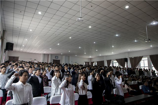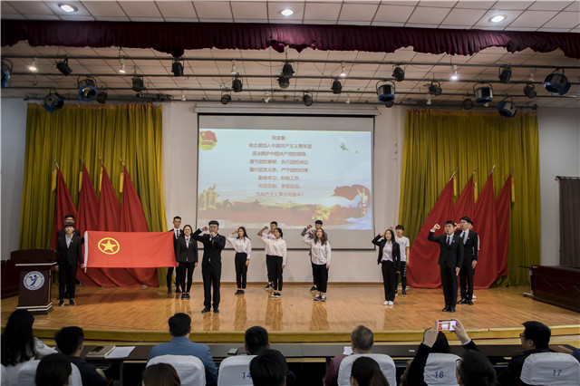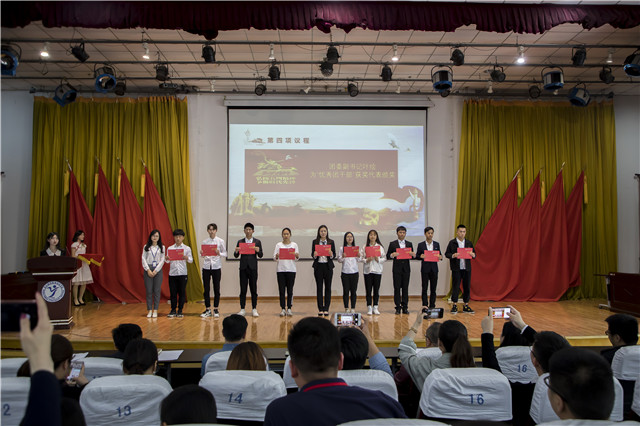 表彰大会在雄壮的《中华人民共和国国歌》歌声拉开帷幕。我们的党,历经98年的风风雨雨,始终不变的是全心全意为人民服务的宗旨,在他的旗帜下,涌现出许许多多优秀的中华儿女,前赴后继,为中华之强盛而奉献青春和生命。全体新老团员在团员代表朱砾的带领下重温了入团誓词。