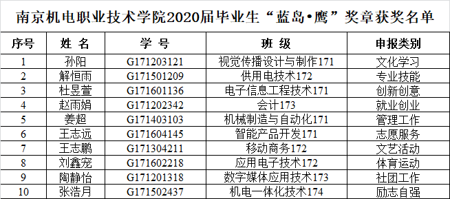 根据《亚搏在线关于开展2020届毕业生“蓝岛•鹰”奖章评选推荐工作的通知》,经系部评审小组初步审核,学工处复核,专家评审组评审,决定拟推荐以下10名同学为2020届毕业生“蓝岛•鹰”奖章获得者。现予以公示,公示时间:2020年7月2日—2020年7月6日。联系人:宁燕,电话:025-84190262。