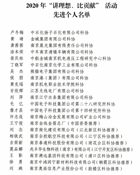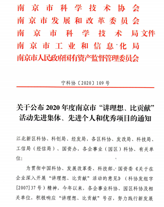 近日,南京市科协、南京市发改委等联合发文,表彰2020年度南京市“讲理想、比贡献”活动先进集体、先进个人和优秀项目,学校科协被授予先进集体称号(我院科协是唯一获此殊荣的高校科协),学院黄克瑶同志被授予先进个人称号。
