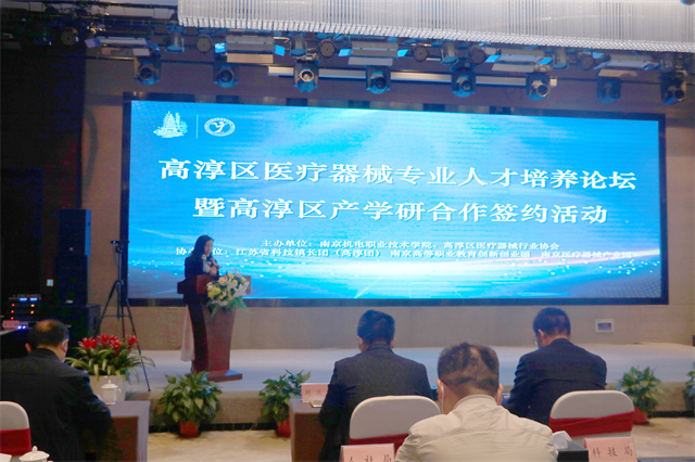 为促进高淳区医疗器械行业产业高质量发展,提高人才培养水平和科技创新能力,进一步服务区域经济发展,2022年5月13日,高淳区医疗器械专业人才培养论坛暨高淳区产学研合作签约活动在高淳区紫荆花园酒店举行。本次论坛及签约活动由亚搏在线、高淳区医疗器械行业协会主办,江苏科技镇长团、南京高等职业教育创新创业园、南京医疗器械产业园协办。南京市市场监督管理局二级巡视员蒋永兆,高淳区人民政府副区长张成,副区长刘敏,江苏高淳经济开发区管委会主任杨时平,南京市场监督管理局医疗器械监管处副处长沈洲,南京高等职业教育创新创业园党工委书记刘宜军,高淳医疗器械行业协会理事长江文养,高淳医疗器械行业协会秘书长连儒强,亚搏在线党委书记、院长周庆礼,党委委员、副院长刁爱军等领导出席活动,江苏科技镇长团(高淳团)、高淳区市场局、科技局、工信局、人社局、医疗器械园推进办、亚搏在线系部领导以及南京医疗器械产业园八家龙头企业等60余嘉宾参与活动。本次活动由科研及校企合作处处长李木香主持。