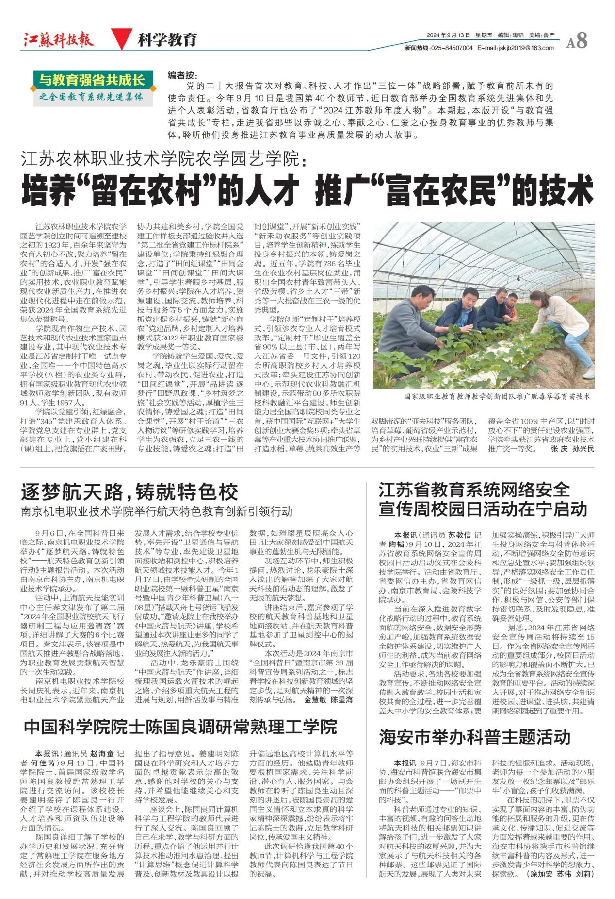 近日,江苏科技报报道中国工程院院士龙乐豪来我校参加“逐梦航天路,铸就特色校”——航天特色教育创新引领活动,全文如下: