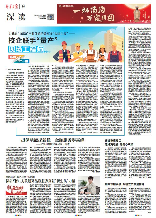 日前,《新华日报》2024年9月20日第9版报道校企联手“量产”现场工程师,我校现场工程师班大三学生丁旭接受采访,全文如下: