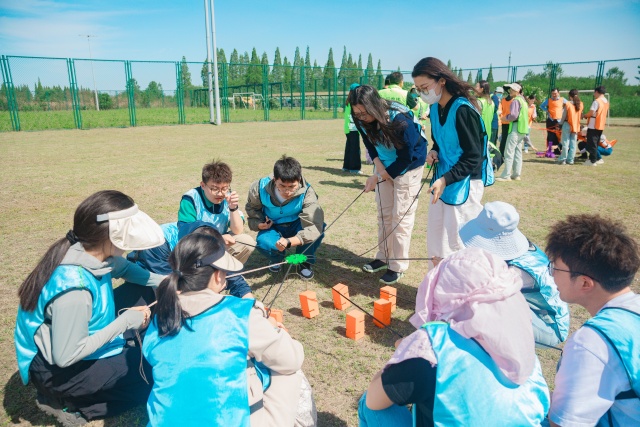 下午,辅导员素质拓展培训活动在高淳水慢城围绕破冰融合和协同共进开展。破冰游戏“趣味接龙”迅速点燃现场氛围。两校辅导员通过随机分组完成互动任务,在欢声笑语中打破了初次见面的拘谨。团队组建环节将活动推向高潮,各队需在10分钟内确定队名、口号及队歌,并完成创意展示。嘹亮的口号与改编的队歌展现了辅导员们的激情与活力。在“草帽连连看”项目中,队员们需通过策略沟通与记忆配合,在规定时间内翻找匹配的草帽图案。各组不断优化分工方式,有的采用“分区记忆法”,有的实行“接力协作制”,充分体现了团队智慧。“步步高升”挑战则考验团队的耐心与执行力,队员们需合力操控绳索,将积木逐层垒高。过程中,大家从手忙脚乱到默契配合,不断刷新活动纪录,引发阵阵欢呼。