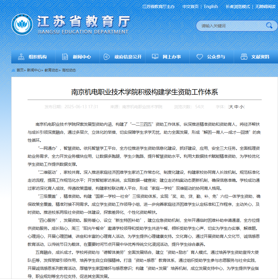 近日,江苏省教育厅报道:亚搏在线积极构建学生资助工作体系,全文如下:
