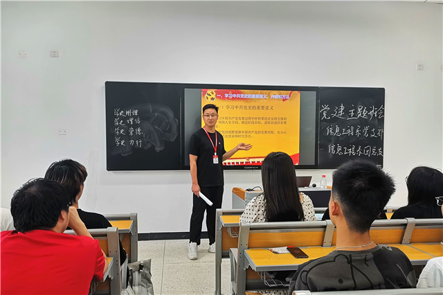 其次,信息工程系团总支书记于宇围绕《重温中国共产党党史》进行主题发言,从学习中共党史的重要意义、内容和方法,带领学生重温党的光辉历史,号召广大青年深入学习党史,全面贯彻习近平总书记对青年学生的要求,重实践、勇担当、讲奉献,在日常生活中展现青年活力、青年担当,努力成长为能够担当民族复兴大任的时代新人。