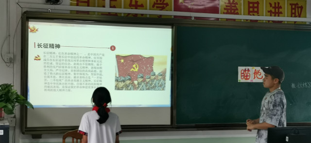 宣讲主题班课上,主讲人陈童和龚燕明同学,通过一个个生动有趣的小故事向港口小学的青少年讲诉了长征过程中红军四渡赤水的机智、飞夺泸定桥的英勇、过雪山时的艰难、过草地时的坚强以及最后三军会师的壮观景象,形象地表述了“长征精神”的四大主要内涵——乐观主义、英雄主义、创新胆略、集体主义。青少年学习并感受了“长征精神”,对于他们今后的学习、生活都有着重大的指导意义。