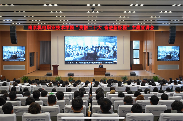 会议邀请到江苏省委宣讲团成员、南京航空航天大学马克思主义学院院长、教授、博士生导师王智以《在新征程上全面推进中国式现代化——深入学习贯彻党的二十大精神》为题作主题宣讲。王教授从中国式现代化与实现中华民族伟大复兴的历史进程、在新时代历史性成就和历史性变革中开启新征程等四个方面系统梳理了中国式现代化的科学内涵、鲜明特色、本质要求和前进道路上必须牢牢把握的重大原则,同时全面对标对表党的二十大作出的战略部署和安排,为我校师生深入解读了习近平总书记为江苏擘画的建设“强富美高”新江苏的宏伟蓝图。