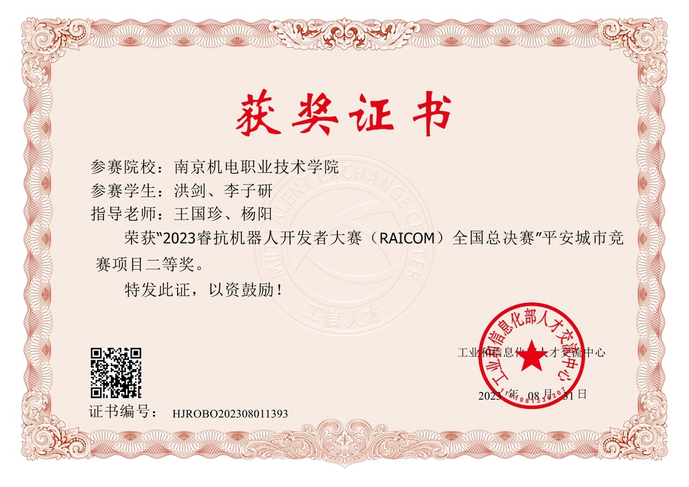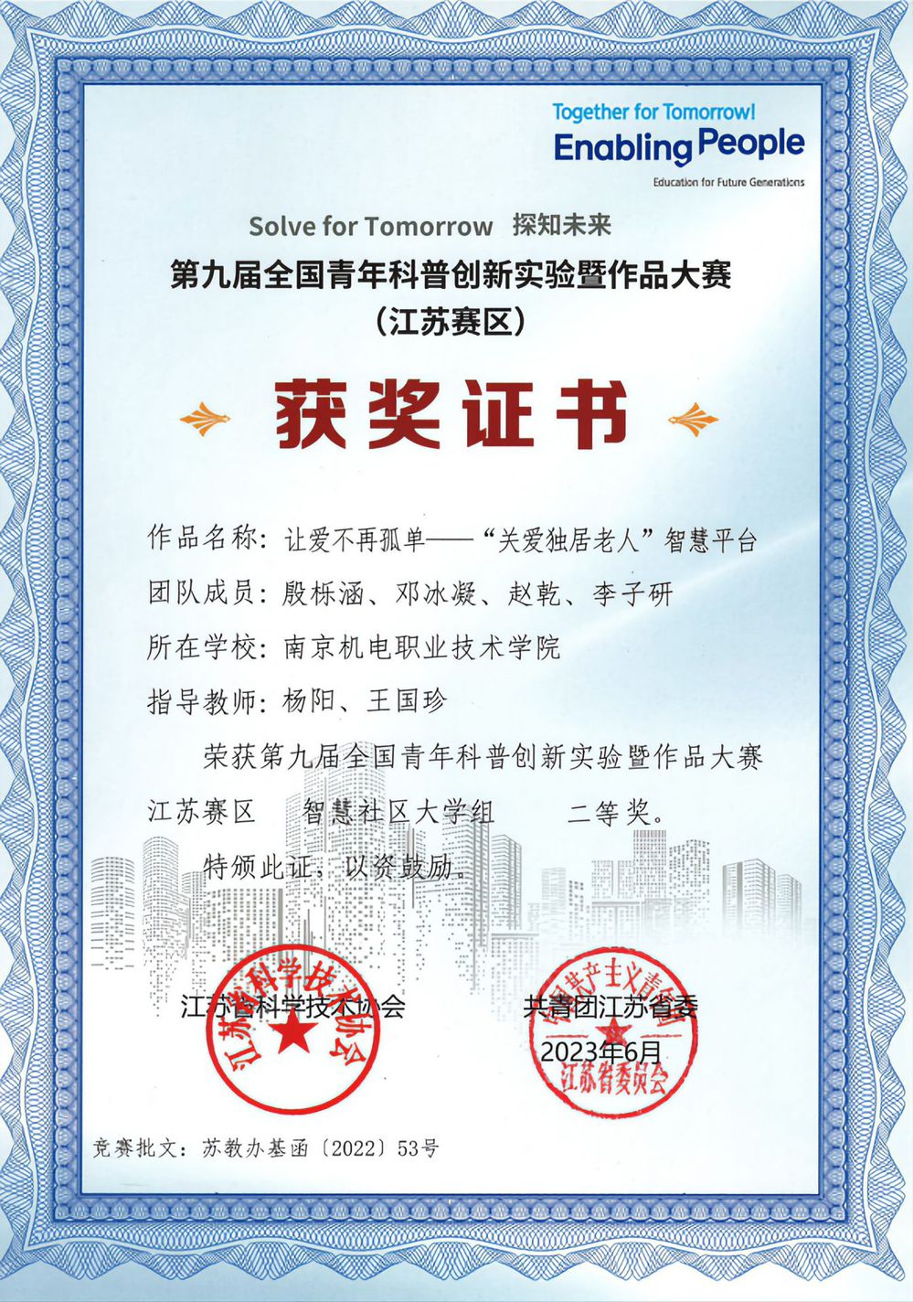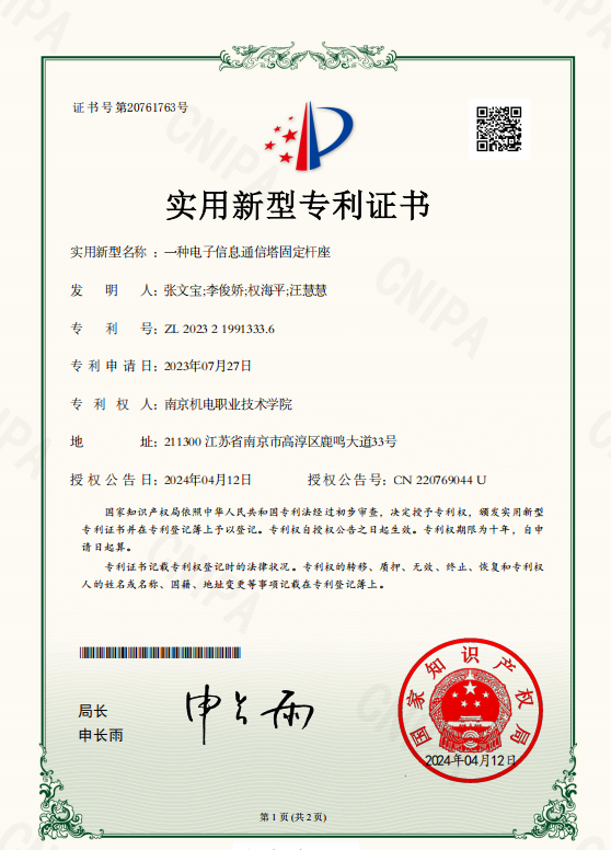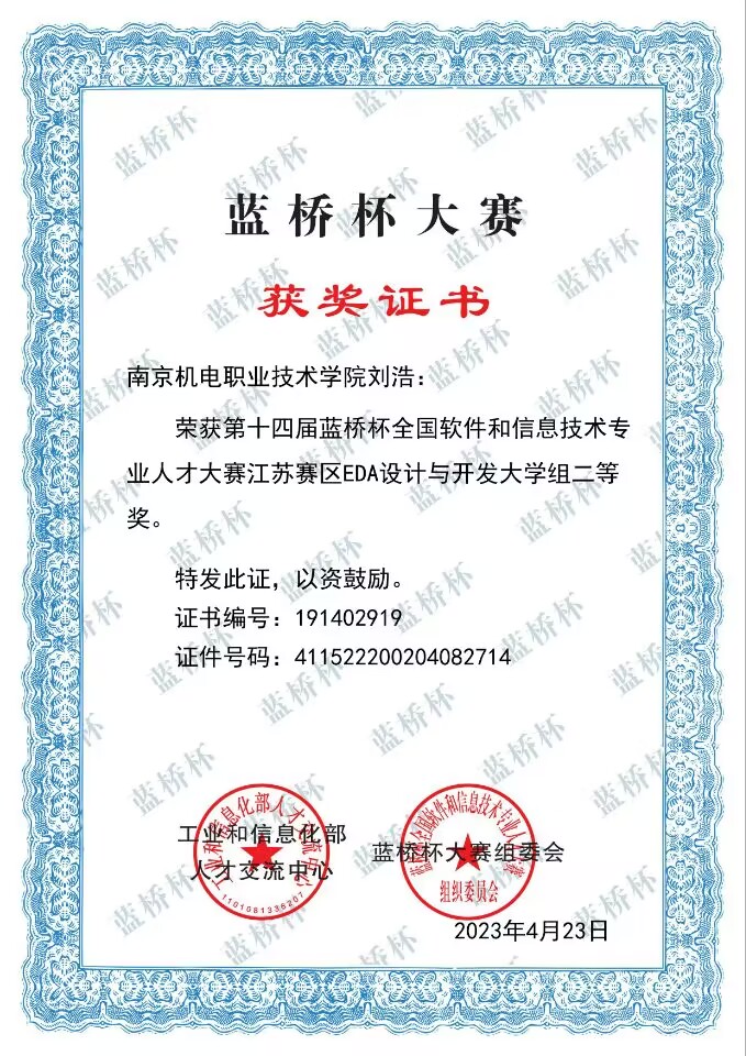 2021届电子信息工程技术专业毕业生,在校期间虚心好学,品学兼优两次荣获国家励志奖学金。曾获得“三好学生”、“优秀共青团员”、双创班“优秀学员”、第二届中英STEAM国际创新大赛“最佳三维设计奖”、第二届全国大学生创新体验大赛“三等奖”、第三届中英STEAM国际创新大赛“一等奖”以及“最佳作品展示奖,申请并授权三项实用新型专利。现就职于南京长峰航天电子科技有限公司,并在2022年度获先进个人称号。