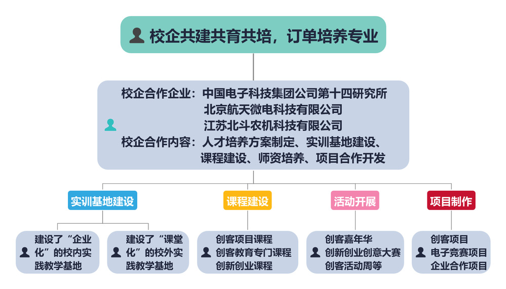 电子信息工程技术专业在大众创业,万众创新的时代背景下,创新构建“创客教育+职业教育”双轨融合的人才培养模式,依托校企深度合作,通过“订单培养、协同创新、项目驱动”等方式,强化学生创新创业能力和专业技术技能。与行业龙头企业共建实训基地,引入真实生产项目,培养具备电子电路设计、智能硬件开发、系统测试等核心能力的创新型技术技能人才,精准对接南京市“4+2+6+6”产业集群中电子信息产业的高素质人才需求,助力区域经济高质量发展。