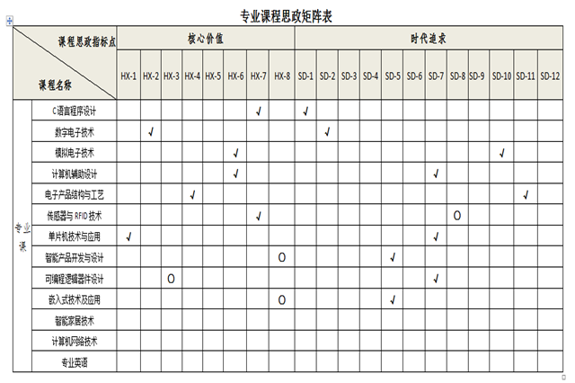 2021年6月8日,电子系全体教师在思学楼105集中学习学院课程思政的建设方案,后分教研室研讨各专业课程思政矩阵。我专业教师梁昕、张晨、邱娟、李华根据智能产品开发专业课程特点及目标要求,按通识课程、专业课程、专业实践课程分类研讨出课程思政矩阵如下,明确各课程融入的指标点。