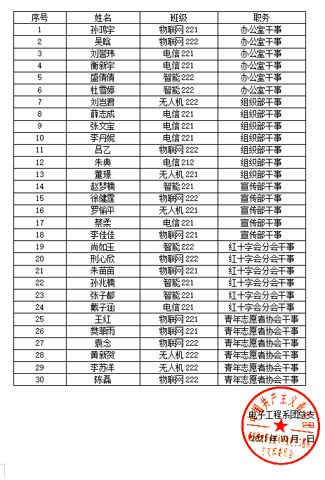 新团体,新血液,电子工程系团总支迎来了新成员的加入,经过本人申请、组织评议和公开竞选,团总支成员选拔工作已全部完成,现将新干事人员名单公示如下:
