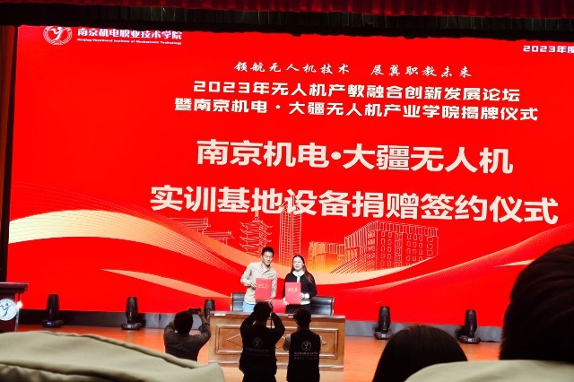 2021年,学校与深圳市大疆创新科技有限公司签订共建“南京机电-大疆无人机产业学院”校企合作框架协议,构建“产、学、研、创、用”于一体,互补、互利、互动、多赢的行、校、企协同育人平台。刁爱军表示,未来学校与深圳大疆创新科技有限公司将共同探索示范性全路径培养模式,打造以人才培养、技能竞赛、教师实践、技术培训、社会服务功能于一体的产学研创”现代服务产业学院。揭牌及签约仪式上,学校党委委员、副校长刁爱军与深圳市大疆创新科技有限公司华东区代表滕菲共同为“南京机电•大疆无人机产业学院”揭牌。学校电子工程系主任姚小冬与滕菲为“南京机电•大疆无人机实训基地”揭牌。学校党委委员、纪委书记、工会主席姜振宇与南京弘谷信息科技有限公司总经理赵华君共同签订“南京机电•大疆无人机实训基地设备捐赠协议”。电子工程系副主任丁向琴与南京弘谷信息科技有限公司副总经理顾启凌共同签订“南京机电•大疆无人机产业学院第一个合作项目协议”。学校与深圳市大疆创新科技有限公司将本着优势互补、共同发展的宗旨,坚持“育人为本、产业为要、产教融合、创新发展”的建设原则,以区域无人机产业行业发展急需为牵引,立足机电学院办学定位和发展思路,建立长期、紧密的合作关系,打造融专业人才培养、关键核心技术研究、前沿技术创新应用推广、专业师资赋能、辐射地方产业、企业孵化服务、学生创业辅导等功能于一体的无人机领域示范性人才培养实体。