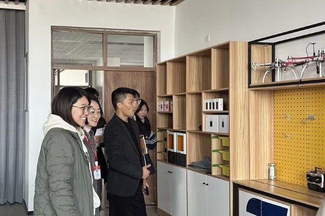 随后,众人移步至无人机实训基地参观。在这里,大家近距离接触到多旋翼、固定翼以及垂直起降等多种类型的无人机,涵盖了从入门级教学机型到用于科研、行业应用的高端设备。司翠平详细介绍了无人机的核心组件,如飞控系统、动力系统、通信链路等,深入剖析了其工作原理与技术发展趋势,包括先进的导航算法、智能避障技术以及载荷搭载能力等。随行学生对无人机技术展现出浓厚兴趣,围绕传感器精度、续航能力提升等问题与专业教师展开交流。