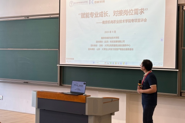 开始环节,特邀合作企业——百科荣创科技发展有限公司的企业工程师李思成分享。李工首先简要介绍了百科荣创的公司背景,重点阐述了公司与专业的深度产教融合模式。他从“专业产业赋能”角度,介绍了双方共建的智能产品开发实验室,强调了企业资源如何直接赋能专业教学,使学生能接触到行业最前沿的技术与设备。在“专业技能培养”方面,他详细说明了企业将为学生提供的实习实训机会、项目实战资源和技能认证体系,为同学们勾勒出一条从校园到企业的清晰成长路径,坚定了大家学好专业的信心。