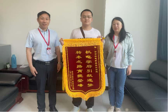 分享会尾声,陈家强同学怀着感恩之情,向母校亚搏在线赠送锦旗,锦旗上“机电学府引航逐梦,转本之路育我登峰” 的字样熠熠生辉,饱含着他对母校培育之恩的深切感激。培训处处长周云龙、信息工程系党支部副书记陈雪作为校方代表郑重接受锦旗。周云龙处长表示,这面锦旗不仅是对学校教育教学工作的肯定,更是一种激励,学校将继续努力,为学生成长成才搭建更好的平台。陈雪副书记也鼓励在场同学以陈家强为榜样,明确目标,努力拼搏,在专转本和未来的职业发展道路上实现自己的理想。