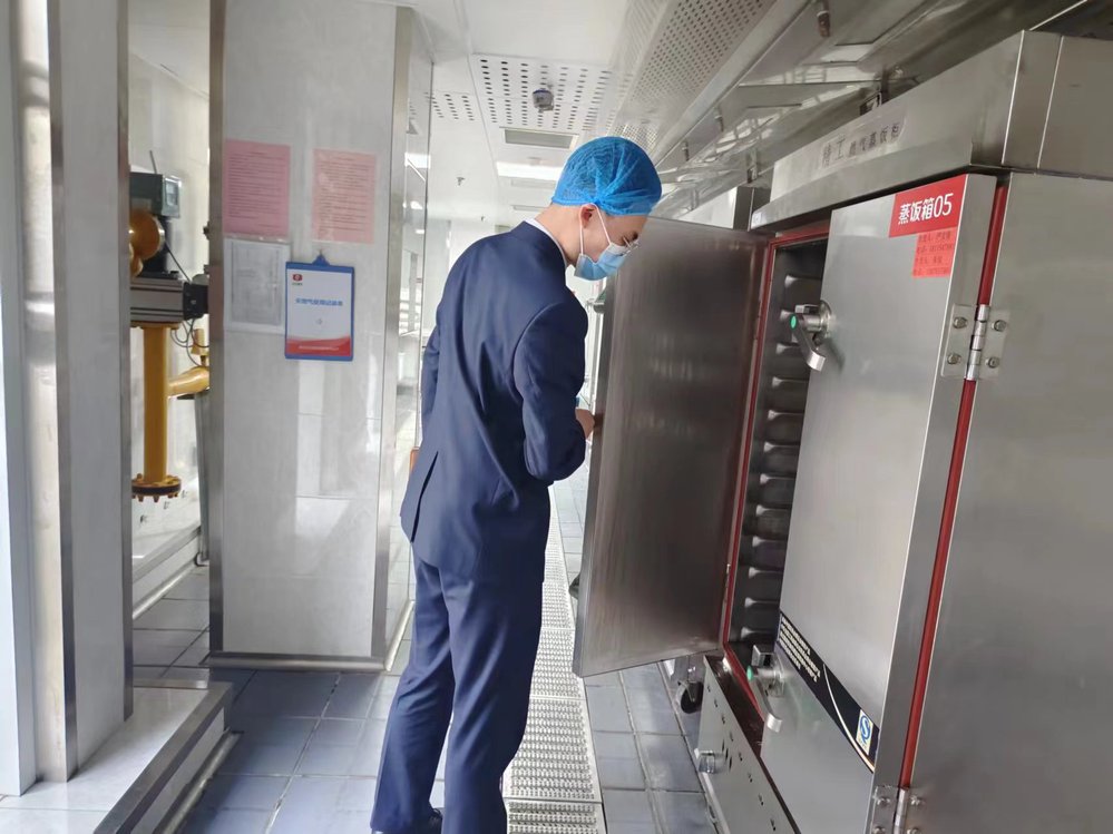二楼食堂现场经理对目前运行了食品安全管理情况进行了汇报,全面了解食品安全“8S”管理体系与机电学院“11633”安全管理体系融合及执行情况,并从食品安全源头管控、食品安全操作流程的规范度、员工卫生安全习惯等涉及食品安全的方面进行详细地检查。