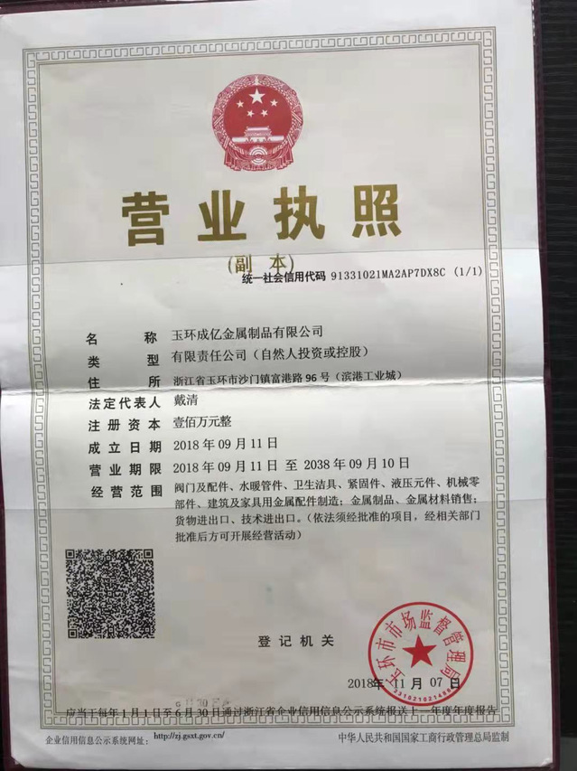 2021年7月—至今:玉环成亿金属制品有限公司 监事