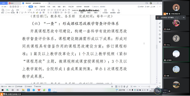 接着我们学习了学院课程思政建设实施方案:“七个一”即“一图(矩阵图)一案(人才培养方案)一课(课程)一库(素材库)”和“一研(教研)一查(督查)一赛(竞赛)”要求,将课程思政的元素纳入所有专业的人才培养方案、课程标准和课堂教学中。