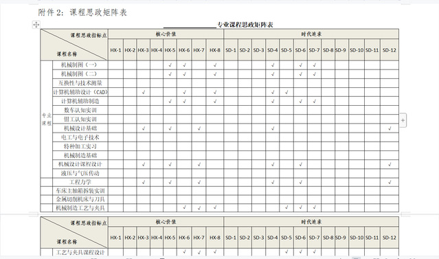 最后,机制专业的每位老师针对自己所教学课程,对照着课程思政二十条,根据课程特点及目标要求,按专业课程、专业实践课程分类建立课程思政矩阵,明确各课程融入的指标。