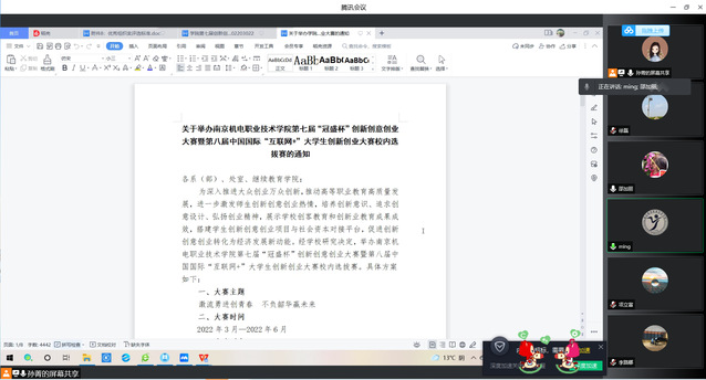 为深入推进大众创业万众创新,推动高等职业教育高质量发展,进一步激发师生创新创意创业热情,培养创新意识、追求创意设计、弘扬创业精神,展示学校创客教育和创新业教育成果成效,搭建学生创新创意创业项目与社会资本对接平台,促进创新创意创业转化为经济发展新动能,学校决定举办亚搏在线第七届“冠盛杯”创新创意创业大赛暨第八届中国国际“互联网+”大学生创新创业大赛校内选拔赛。 2022年4月2日上午,机械设计与制造教研室全体老师在腾讯会议线上平台对校内选拔赛具体内容进行学习,会议由教研室负责人孙菁主持。