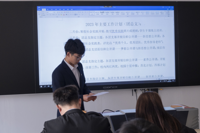 于子涵同学逐条介绍2023年春学期团总支工作安排,并对重点工作进行详细解释和安排。各部门部长依次发言,指导春学期团学工作。会议过程中,全体学生干部专注听讲,认真记录。