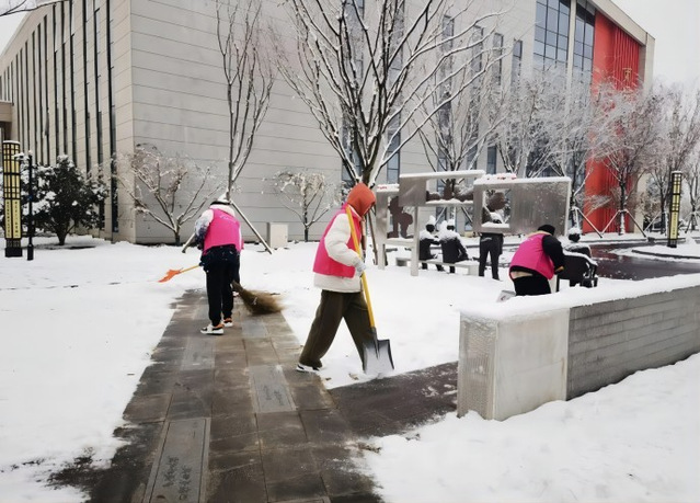 以雪为令,迎寒而上,扫雪队员们在清晨就早早赶至笃行楼,按事先的分工部署集结在指定扫雪区域。他们斗志昂扬,在冰雪中坚守,或持铁锹,或执扫帚,一起撸起袖子加油干,投入到热火朝天的扫雪除冰行动中。虽然雪仍在下,但是校园已经焕然一新,师生们行走在敞亮的道路上,安稳而踏实,扫雪队员们挥汗如雨的忙碌身影也在皑皑白雪的掩映下,构成了一道有爱、动人的校园风景线。