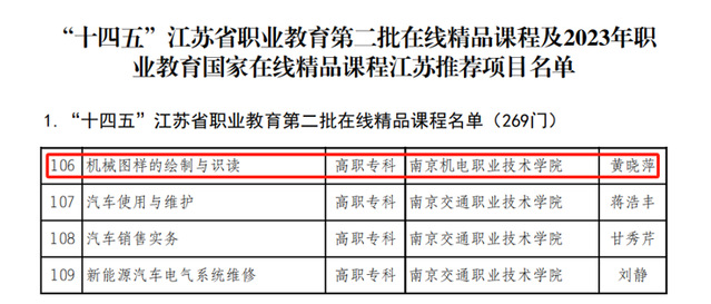 近日,江苏省教育厅公示了“十四五”江苏省职业教育第二批在线精品课程及2023年职业教育国家在线精品课程江苏推荐项目名单,机械工程系黄晓萍教师团队建设课程的《机械图样的绘制与识读》课程被成功立项为“十四五”江苏省职业教育第二批在线精品课程。本次推荐名单共确定了269门课程(职业本科3门、高职214门、中职52门)为“十四五”江苏省职业教育第二批在线精品课程。