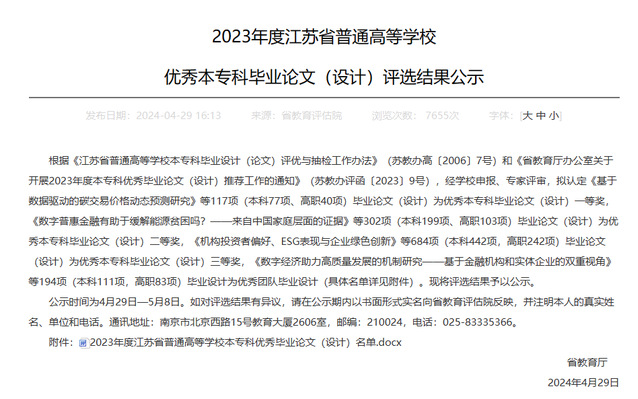 喜报:我系学生荣获2023年度江苏省普通高校本专科优秀毕业论文三等奖