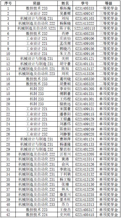 为激励在校大学生勤奋学习,努力进取,在德、智、体、美、劳等方面得到全面发展,同时也为了资助在校品学兼优的学生顺利完成学业,根据教育部、财政部及省教育厅、财政厅国家奖助学金相关管理规定和《亚搏在线奖学金评选及管理办法》(南机电院学〔2023〕23号)要求,机械工程系认真组织评选工作,经过本人申请,班级评议,现将2023-2024学年亚搏在线奖学金公示如下: