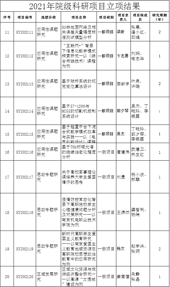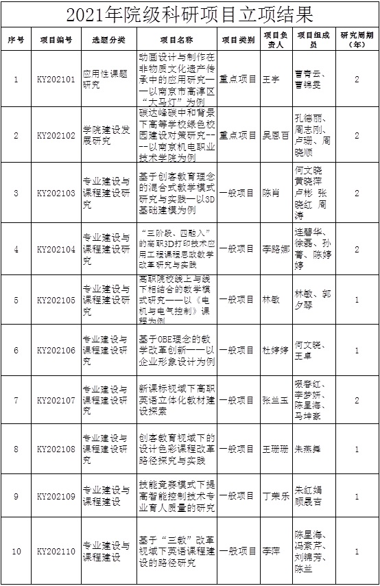 根据《关于申报2021年亚搏在线院级科研项目的通知》《亚搏在线科研工作管理办法》机电学院[2012]19号、《亚搏在线科研项目管理办法》机电学院[2012]20号文件精神,经科研及校企合作处审核、专家组评议、学院批准,现决定对20项申报项目给予立项,其中重点项目2项、一般项目18项。其中《动画设计与制作在非物质文化遗产传承中的应用研究——以南京市高淳区“大马灯”为例》等2项为院级重点项目,《基于创客教育理念的混合式教学模式研究与实践—以3D基础建模为例》等18项为院级一般项目。