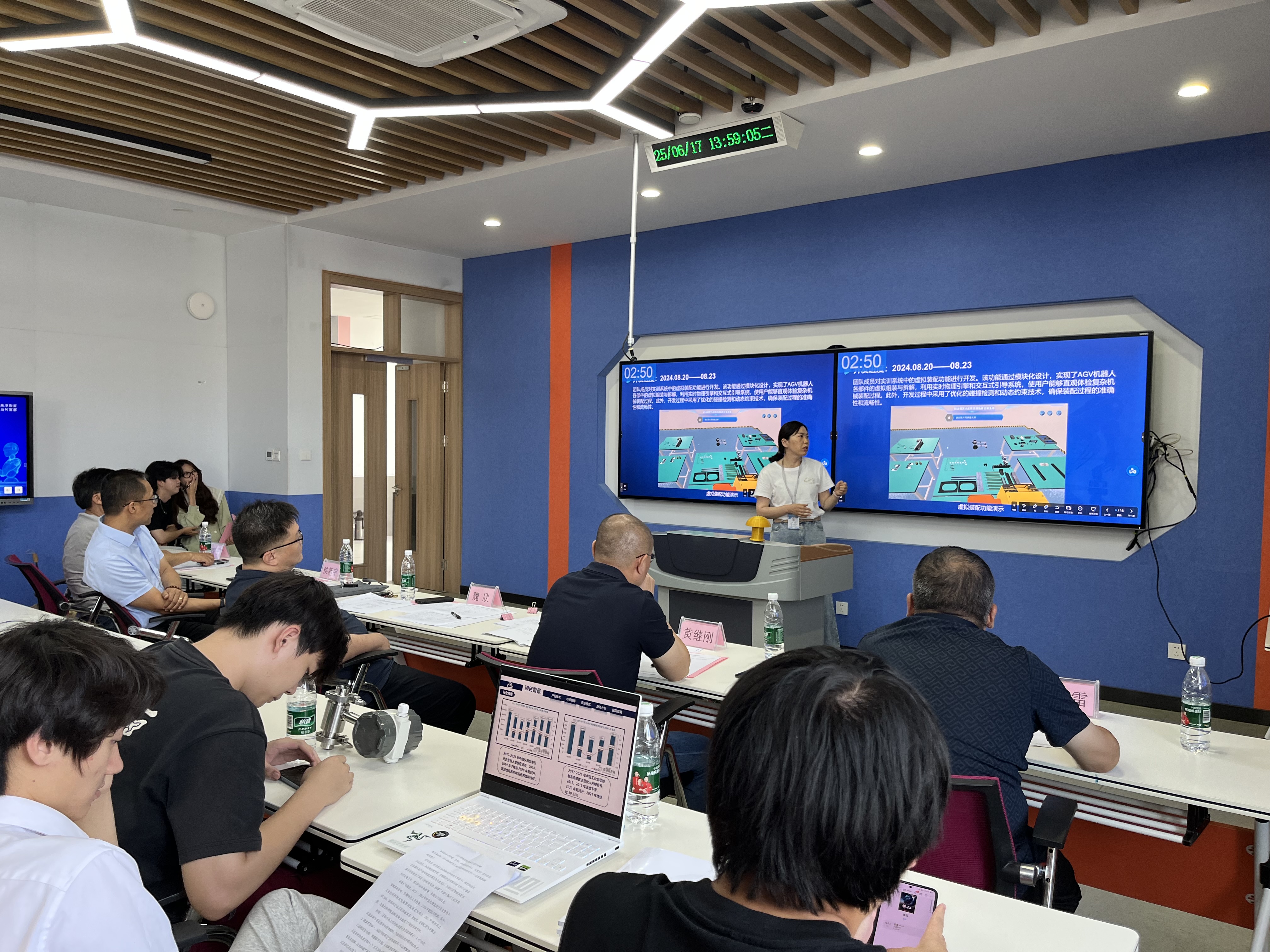 在创新制作组,自动化工程系教师袁芬团队的《虚拟机器人仿真实验平台设计》让学生可以在虚拟环境中反复进行装调和调试练习,全面掌握设备的结构和工作原理,提高实践能力,同时实现在线实训教学,打破时间和空间的限制,满足远程教学的需求。机械工程系学生林志远团队的《旋转升降展台》通过模块化设计,将旋转与升降功能整合,采用电动调节提升稳定性,结合数字化设计与制造技术优化开发流程,打造一款智能旋转升降一体化展台。