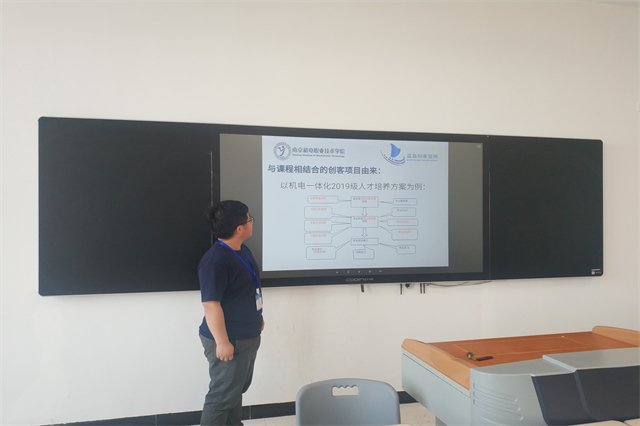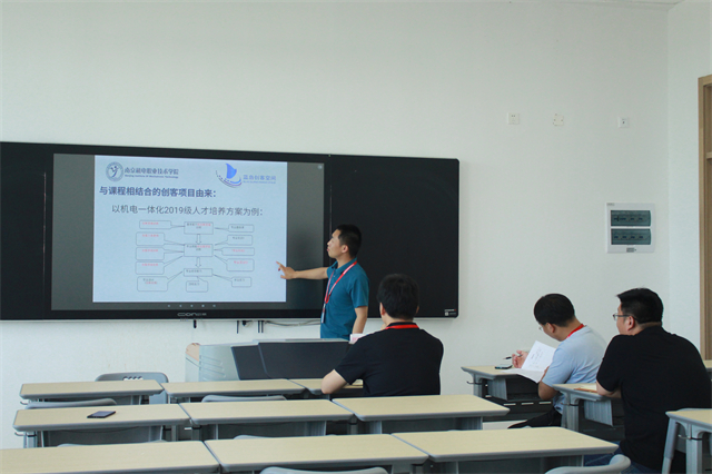 本次教研活动由蓝岛创客空间杨阳老师主持。杨老师说,以我校机电一体化2019级人才培养方案为例,第一阶段,学生学习创新思维训练和专业基础课以夯实基本能力并锻炼创新思维能力,第二阶段,学习创客工具使用、开展创客项目训练和实践以及专业实训来提升专业技能并加强创客项目训练,第三阶段,学生通过毕业设计、毕业实习以及顶岗实习等方式进一步提高专业综合能力。机电一体化2019级的人才培养方案初步形成了创客项目与课程相结合的模式。随后,创新教研室成员就如何进一步落实“创客项目制作与课程相结合计划”展开了深入地讨论。