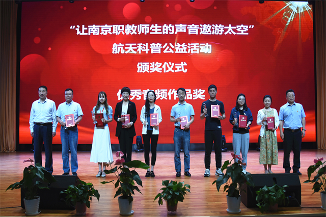 活动现场全场嘉宾观看了中国航天大会宣传视频。视频回顾了中国航天事业的发展历程,追忆了中国历代航天人为中国航天事业起步、发展、腾飞而做出的不懈努力。南京市职业技术教育学会领导宣读了“让南京职教师生的声音遨游太空”系列科普公益活动的获奖名单。南京市莫愁中等专业学校等3所学校的师生获最具内涵奖,南京财经高等职业技术学校等3所学校的师生获最具创意奖,南京高等职业技术学校等3所学校的师生获最具文采奖。亚搏在线、南京高等职业技术学校、南京新港中等专业学校、南京六合中等专业学校等4所学校获最佳组织奖,南京玄武中等专业学校获最佳支持奖。南京市职业技术教育学会在本次活动中获“合作贡献奖”。