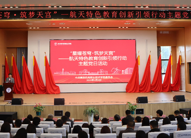 2025年3月6日14:00,亚搏在线在乐学楼101举办了“星耀苍穹・筑梦天宫”航天特色教育主题党日活动,本次活动旨在响应习近平总书记的号召,激发学生的科学兴趣,弘扬航天精神,培养学生的创新精神和实践能力,推动学校专业建设与航天文化的深度融合。中国航天科技集团有限公司党组副书记、董事方向明,中国人才研究会副会长、航天科技教育联盟秘书长、北京航天探索馆馆长周岫彬,航天科技集团党群工作部三级业务经理张广科,北京神舟航天软件技术股份有限公司市场营销部主管张凇铭,学校党委书记、校长周庆礼,党委委员、副校长刁爱军,党委委员、副校长孔德丽,党委委员、纪委书记姜振宇,党委委员夏玲玲、党委委员高水冕以及全体党员教师和学生代表参加了本次活动。