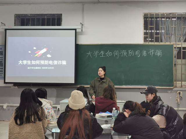 数媒201班于2020年12月4日,在C教学楼115教,由辅导员吴瑶组织开展防电信诈骗的宣传活动。会议中,辅导员吴瑶通过,什么是电信诈骗?大学生被电信诈骗的主要原因?冒充身份诈骗犯罪手法有哪些?以及冒充身份诈骗方法提示。为同学们阐述了校园贷危险性,可怕性。在会议的最后,辅导员吴瑶为同学们提出了“六个一律” “三个不要”等,为同学们识别诈骗分子提供了有效方法。其他班级也陆续展开宣传工作。