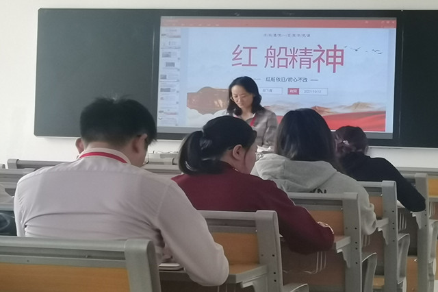 胡老师带领全体老师重温《红船精神》,各党员同志认真学习、认真笔记,用心体会。红船见证中国共产党的诞生。红船精神的内涵包括开天辟地、敢为人先的首创精神,坚定理想、百折不挠的奋斗精神,立党为公、忠诚为民的奉献精神。习近平总书记指出:“‘红船精神’同井冈山精神、长征精神、延安精神、西柏坡精神等一道,伴随中国革命的光辉历程,共同构成我们党在前进道路上战胜各种困难和风险、不断夺取新胜利的强大精神力量和宝贵精神财富。”