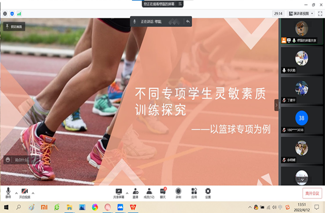 2022年4月12日13:30-15:00,体育教研室在腾讯会议平台开展线上教研活动。会议由教研室主任李庆路担任主持人,教研室12位老师参加会议。