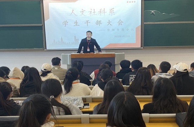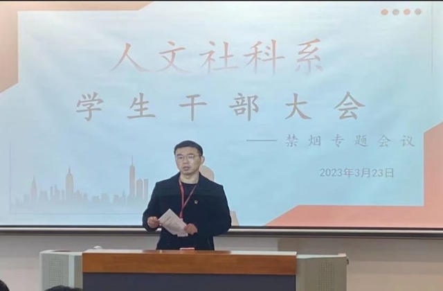为进一步落实《亚搏在线校园禁烟管理制度》、《亚搏在线2023年禁烟工作实施方案》,提高学生干部的思想意识,增强禁烟工作的积极性,带动周围同学进一步实施禁烟管理制度,2023年3月23日,人文社科系在善学楼102召开系部学生干部大会——禁烟专题会。大会由杨军老师主讲,人文社科系全体学生干部参加。