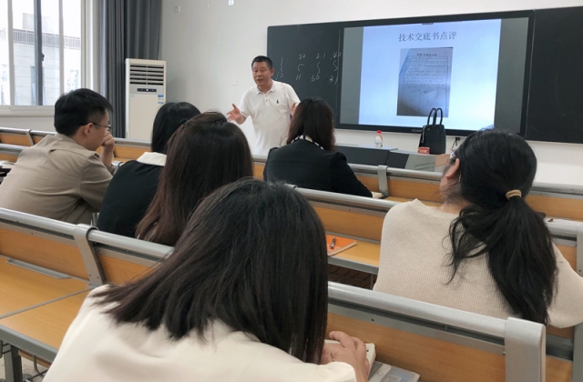 在博学楼305教室的教职工分会场,南京天翼专利代理有限责任公司总经理汤志武以实用新型专利申报为例,以真实案例为切入点,深入浅出地将专利申报流程、申报条件、专利图或照片的制图规范、产品用途及设计要点的撰写方法等知识点为全系教职工做了分享,并为大家做了现场答疑。