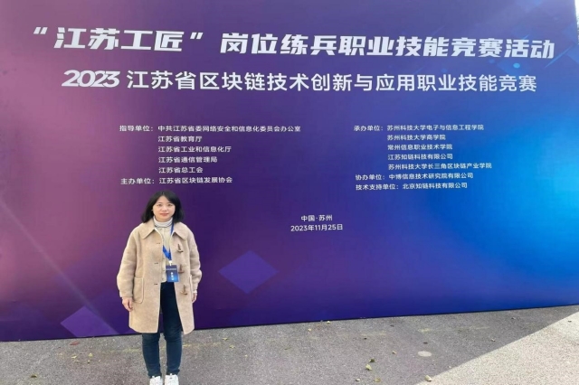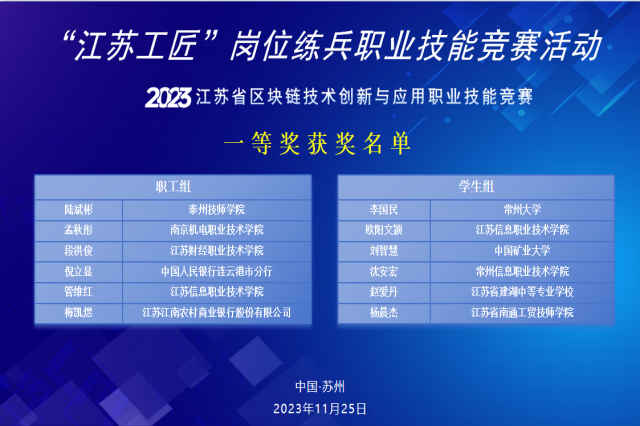 2023年11月25日上午,“江苏工匠”岗位练兵职业技能竞赛——2023年江苏省区块链技术创新与应用职业技能竞赛在苏州圆满落幕,来自省内院校、企事业单位的总计2000余人参加了本次竞赛。经过市赛选拔,我校孟秋彤老师进入决赛,最终以职工组第二名的成绩获得本次竞赛的一等奖,并被授予“江苏省五一创新能手”称号、“江苏省技术能手”称号,同时,亚搏在线被授予优秀组织奖。