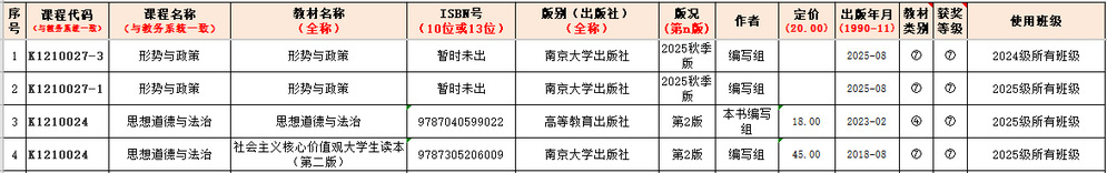 为规范教材建设与管理、做好教材编写、审核、选用等各项工作,提高教材建设水平,确保教材选用质量,依据教育部《职业院校教材管理办法》(教材【2019】3号)、教育部等5部门印发《关于教材工作责任追究的指导意见》和亚搏在线《教材建设与管理实施细则》(南机电院【2020】50号)等文件精神,现将2025年秋季(2025-2026学年第一学期)教材选用的结果(见下表)进行公示。