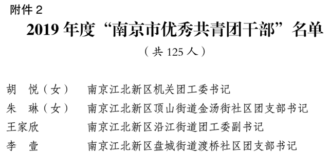 2019年以来,全市各级团组织、团干部和广大团员青年坚持以习近平新时代中国特色社会主义思想为指引,认真学习党的十九大和十九届二中、三中、四中全会精神,深入贯彻习近平总书记系列重要讲话精神特别是关于青年工作的重要思想,紧紧围绕全市建设“创新名城、美丽古都”的总体定位,以“建设青年身边的共青团”为目标,狠抓基层建设、服务中心大局,为南京高质量发展走在全省前列汇聚青春力量,团的各条战线涌现出一大批优秀个人和先进组织。
