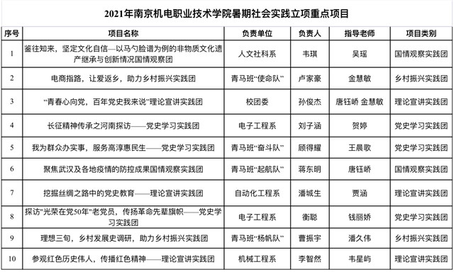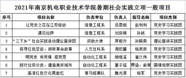 为深入学习宣传贯彻习近平新时代中国特色社会主义思想,贯彻落实习近平总书记关于青年工作的重要思想,引导和帮助广大青年学生上好与现实相结合的“大思政课”,在社会课堂中受教育、长才干、作贡献,在观察实践中学党史、强信念、跟党走,努力成为担当民族复兴大任的时代新人,以实际行动庆祝中国共产党成立100周年,按照团省委《关于开展2021年全省大中专学生志愿者暑期文化科技卫生“三下乡”社会实践活动的通知》相关要求,经自主申报,各团总支、青马班审核推荐,校级专家评审,确定以下10个项目为2021年亚搏在线暑期社会实践重点立项项目,7个项目为2021年亚搏在线暑期社会实践立项一般项目,并对立项的校级重点项目和一般项目进行经费支持,现公示如下:
