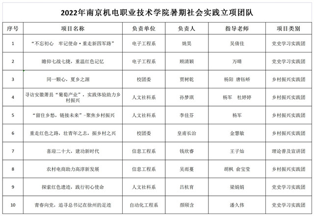 为深入学习宣传贯彻习近平新时代中国特色社会主义思想和党的十九届六中全会精神,贯彻落实习近平总书记关于青年工作的重要思想,深入学习习近平总书记在庆祝中国共产主义青年团成立100周年大会上的重要讲话精神,引导和帮助广大青年学生上好与现实相结合的“大思政课”,在社会课堂中“受教育、长才干、作贡献”,迎接党的二十大胜利召开,根据“三下乡”社会实践活动安排,经自主申报,各团总支、青马班审核推荐,校级专家评审,确定以下10个项目为2022年亚搏在线暑期社会实践重点立项项目,并对立项的校级重点项目进行经费支持,现公示如下: