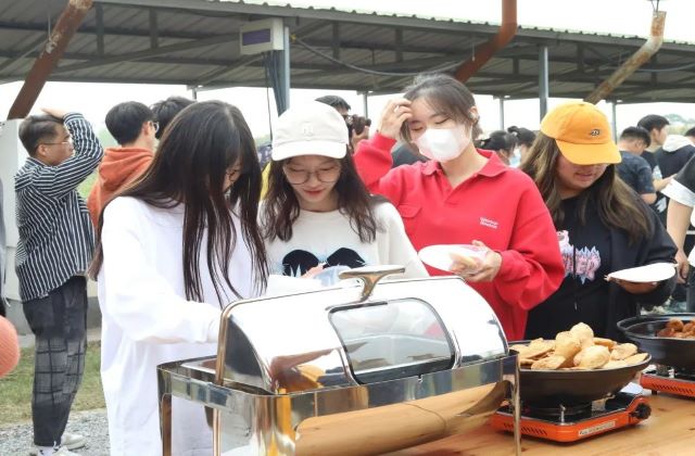 同学们来到拓展训练场地,上午活动开始,全体同学分组进行了一些热身团建小游戏。游戏环节结束后,到了午饭时间,同学们投身到生火做饭的队伍中去。餐桌上摆放着做焖饭的食材,同学们排着队伍进行取菜,本着不浪费的原则选取自己所喜爱的食物。