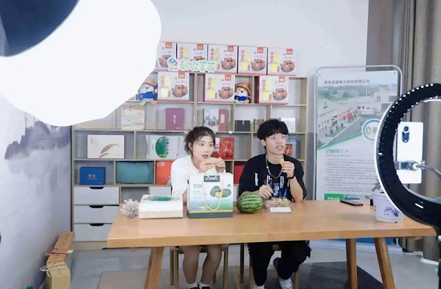在双游电子商务的高淳区漆桥街道老庄山双游农民创业园,学生志愿者们开展了一系列以“直播助农”为主题的暑期志愿服务活动。此次活动旨在帮助当地农产品销售,同时也为农村注入新的活力。该活动的第一项内容主要是参观和学习,志愿者可以深入了解当地生产的农产品种类和品质。紧接着第二项内容就是助农直播,志愿者们通过网络平台展示当地的优质农产品,比如,西瓜、姑娘果、甜瓜、南瓜、竹笋、咸鸭蛋、大米等,并通过直播的方式向全国观众推广。