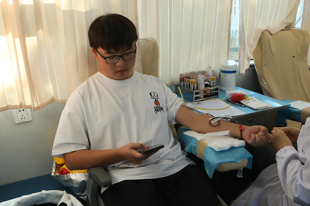 活动现场,献血者在工作人员的引导下认真填表、化验、献血。在献血区,前来献血的同学们纷纷挽起袖管,献出自己的青春热血。等待献血期间,同学们紧张而兴奋,其中不乏参加过好几次献血活动的同学,但是他们仍旧为自己的行动能给需要的人提供帮助、挽救更多的生命而感到高兴。