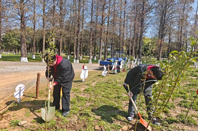 随后,植树活动正式开始。学员们三五成群,分工协作,有的挖坑、有的扶苗、有的培土、有的浇水,现场一片热火朝天的景象。他们小心翼翼地呵护着每一棵树苗,仿佛在为它们种下未来的希望。经过一个多小时的努力,一排排新栽的树苗在春风中摇曳生姿,为水漫城增添了一道亮丽的风景线。
