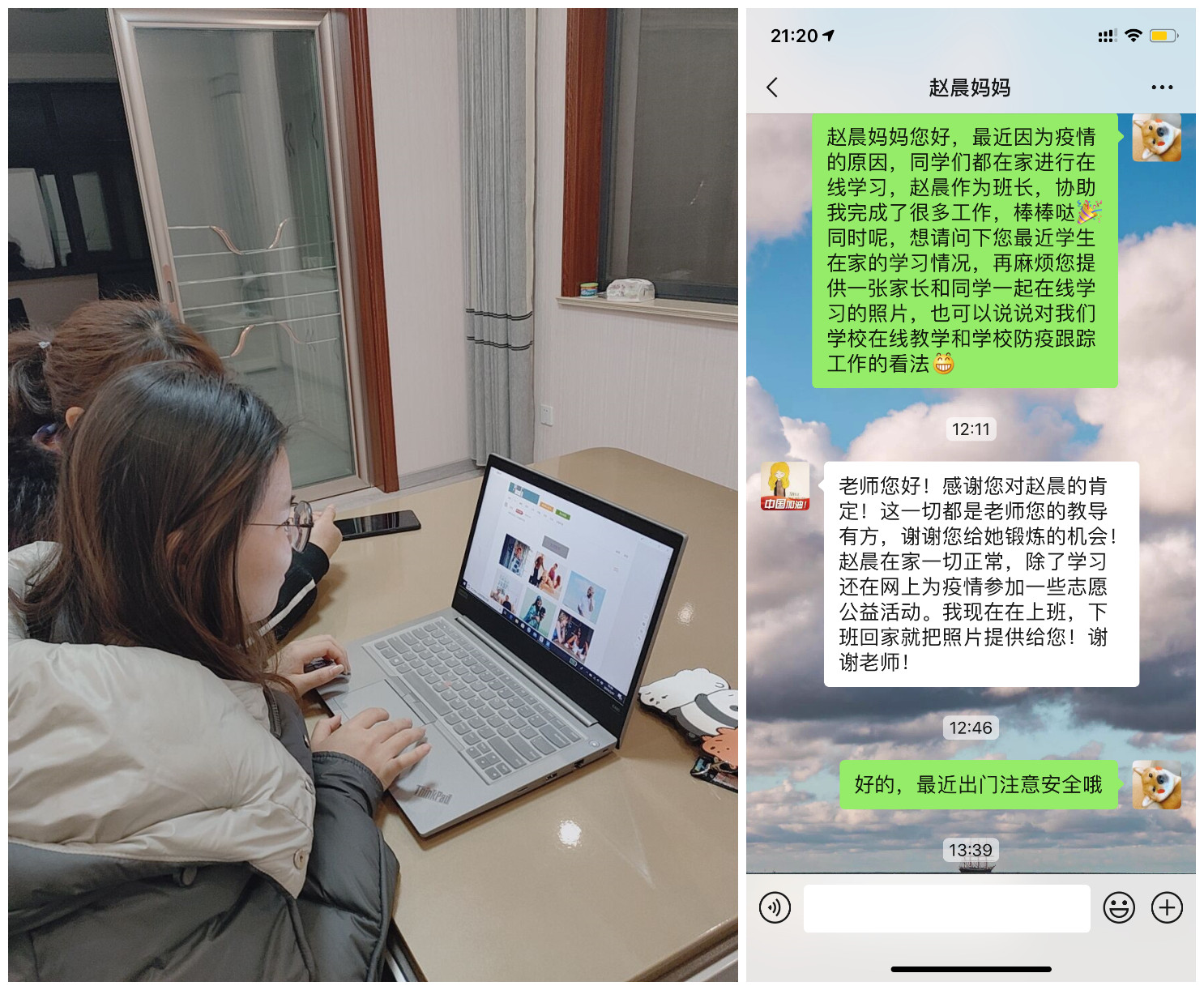 在这个不一样的假期里,面对学生作息时间混乱、假期超长易松弛失去了自控力等问题,通信系统运行管理182班辅导员柳亚婷每日提醒学生每天坚持学习打卡,在线上教学平台及时查看跟进他们的学习情况并进行督促,并挑选成绩全班第一、全专业第一、担任副班长的裘慧玲同学,作为学习标兵在群里进行宣讲,给大家树立正面的榜样。该同学1月19日回浙江省东阳市虎鹿镇仙芝陵村过年,2月9日回到江苏省南京市建邺区南苑街道爱达花园,至今仍旧保持居家隔离的状态,但全程始终坚持学习,积极应对,为转本打好基础。在和家长的沟通中,家长对学院防疫工作也表示大力支持,并对非常时期这种在线学习的方式表示认可。